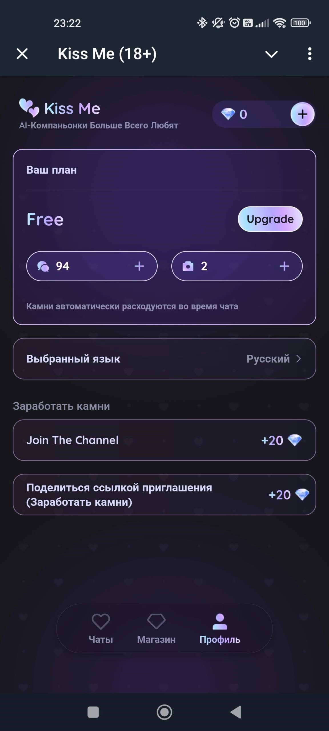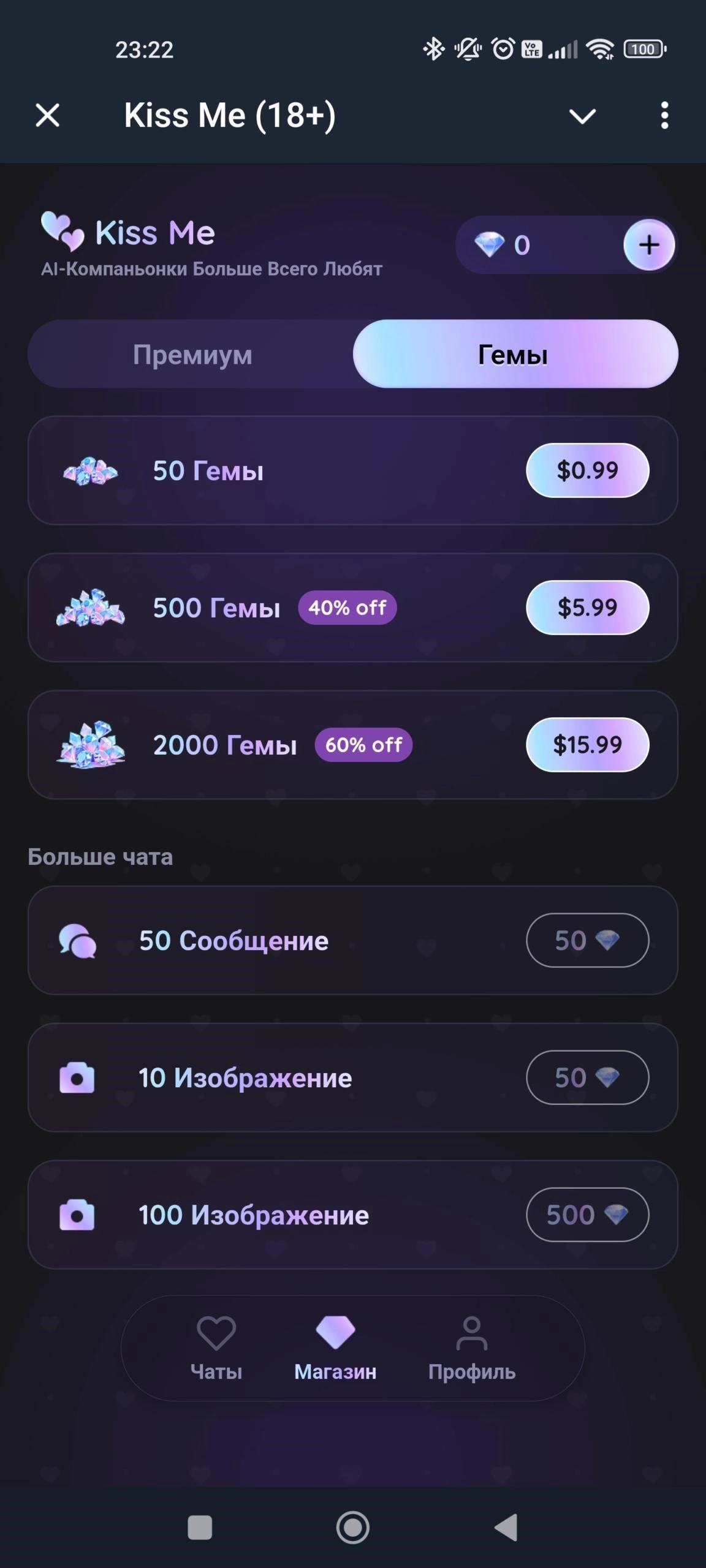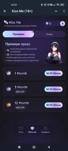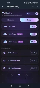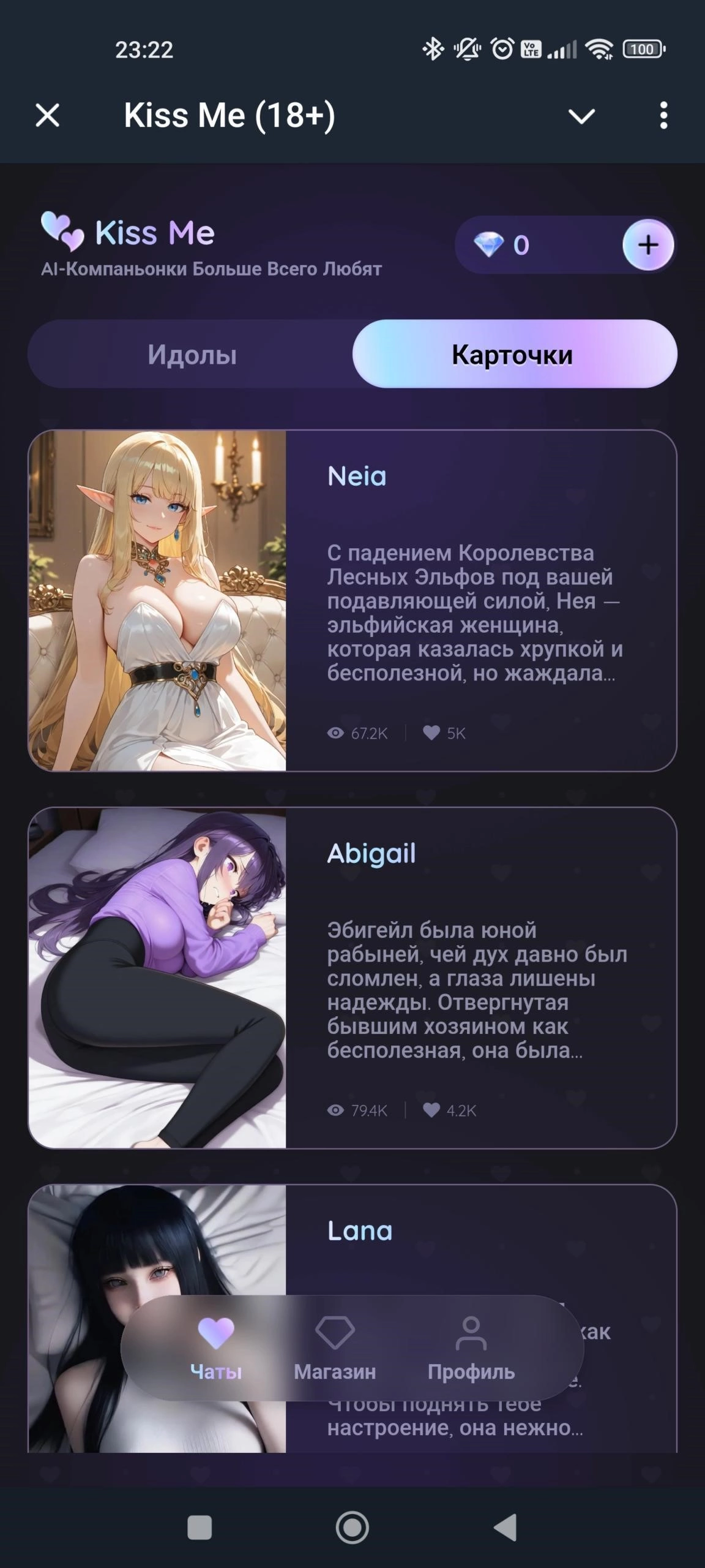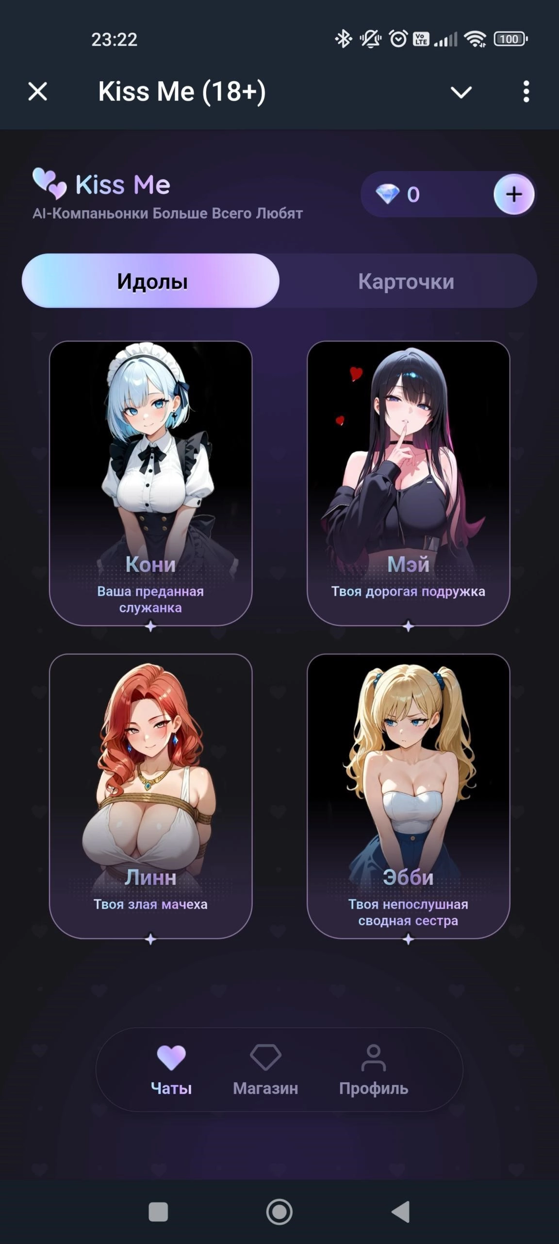 Kiss Me 18+ - мини-приложение с фокусом на флирт и ролевые диалоги. Пользователь выбирает одного из нескольких идолов, общается в тексте или голосе, разблокирует сценарии, проходит викторины и участвует в мини-играх. Формат не претендует на серьёзность: здесь всё построено вокруг лёгкой романтики, интерактива и быстрой смены настроений.