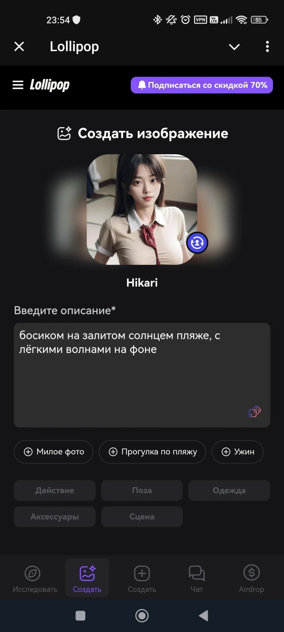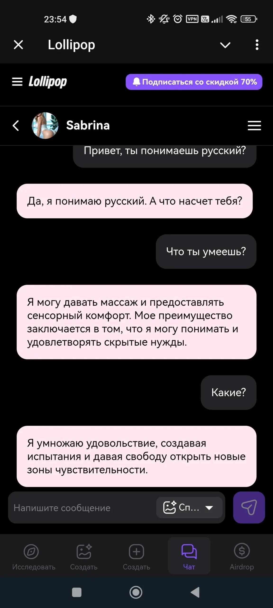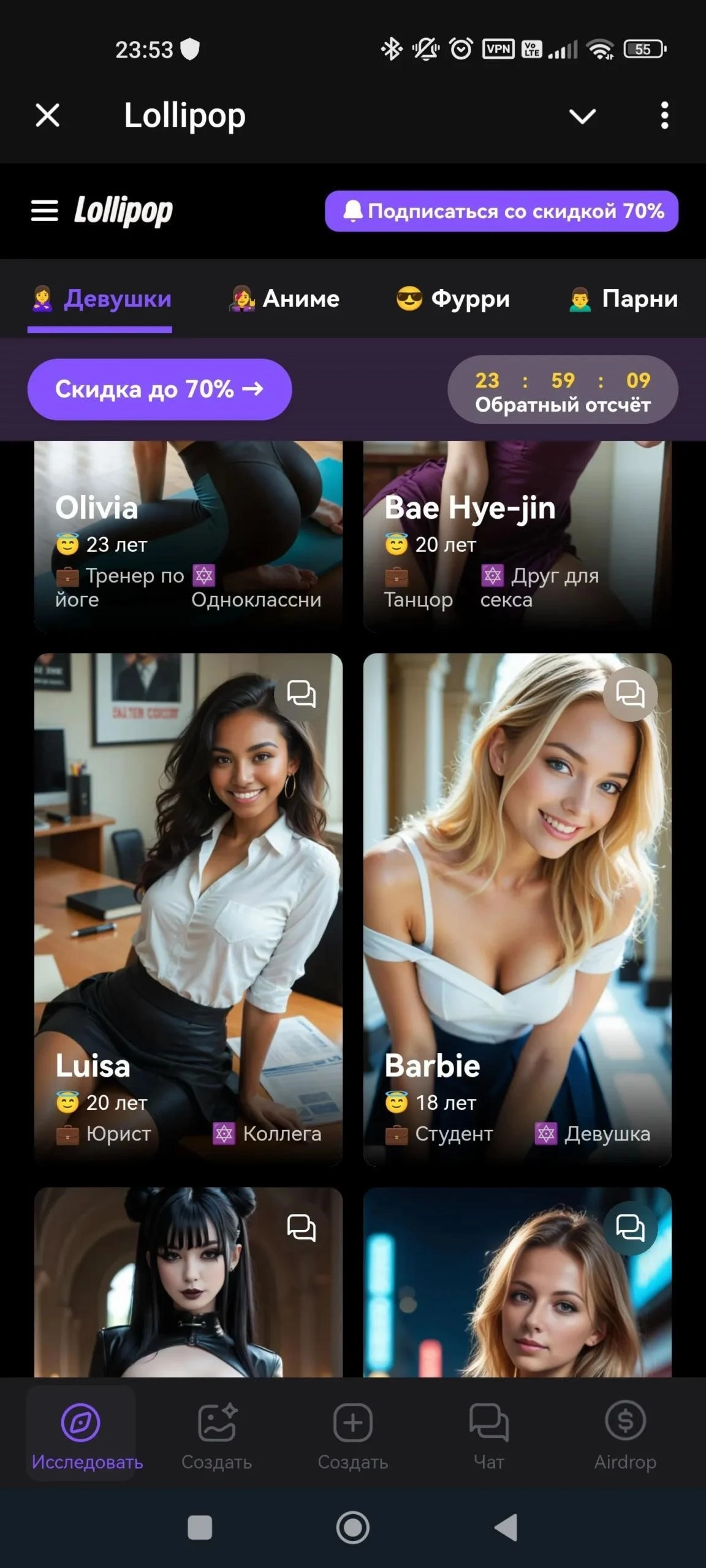 Lollipop 18+ - мини-приложение с ИИ-персонажами для общения, ролевых сценариев и лёгких мини-активностей. Сервис рассчитан на взрослых пользователей, поддерживает гибкую настройку героинь и позволяет переключаться между текстовыми и голосовыми диалогами.
