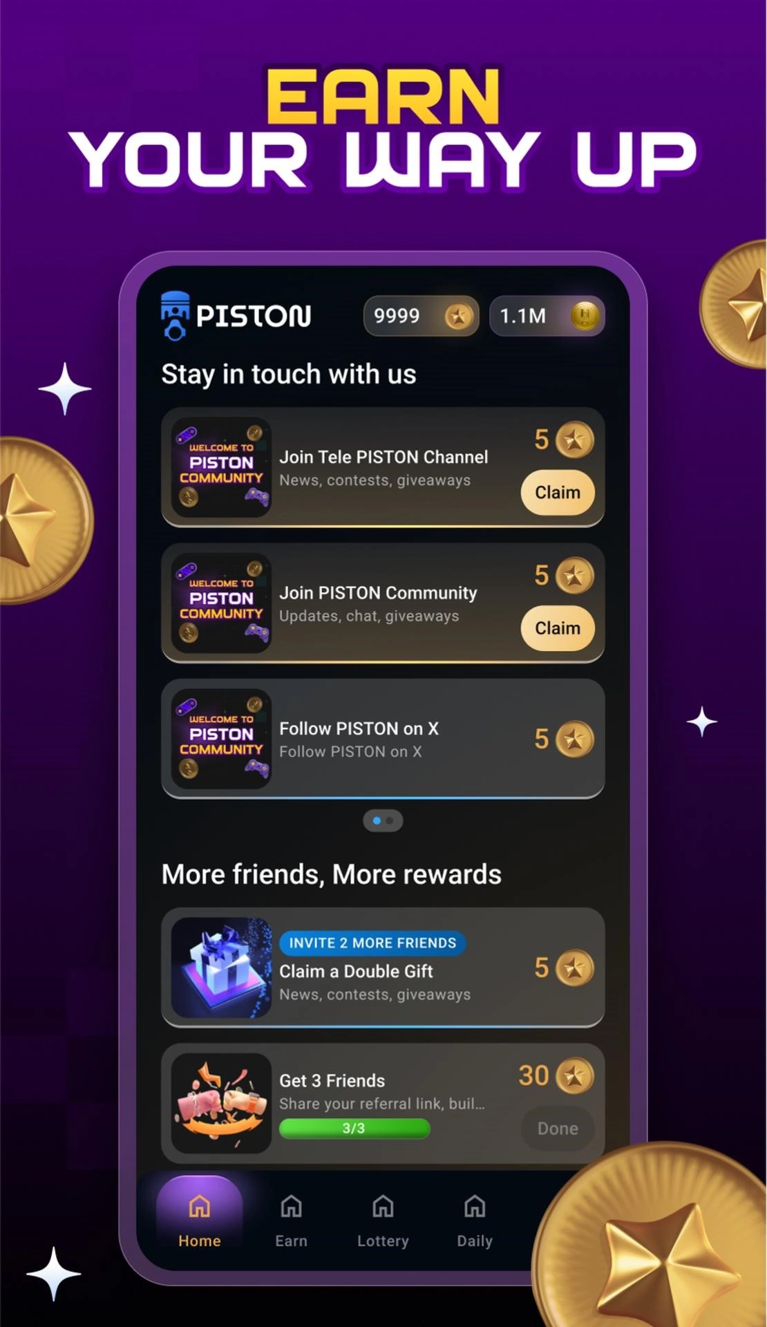 Piston Hub - платформа в формате мини-приложения, сочетающая механику tap-to-earn с элементами игрового взаимодействия и токенизированной экономики. Юзеры получают возможность зарабатывать внутриигровые активы и участвовать в мем-коин экосистеме через простые и динамичные механики.