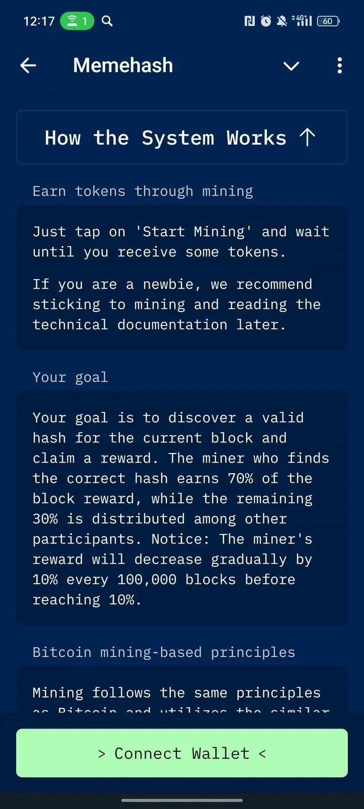 Memehash - мини-игра, в которой пользователь запускает добычу ограниченной эмиссии внутриигровых токенов за счёт вычислений на своём устройстве. Когда лимит выпуска будет исчерпан, начисленные токены распределят между участниками на блокчейне TON.