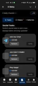 Meta - мини-приложение в мессенджере для крипто-активностей: задания, участие в роздачах и внутренняя прогрессия. Бот помогает вовлекать аудиторию через игровые механики и простые действия без лишней онбординга.