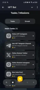 HFT Bot - мини-приложение с геймификацией: юзеры майнят очки, выполняют задания, приглашают друзей и соревнуются в таблицах лидеров за награды. Такие механики заявлены на странице бота и в его профиле.