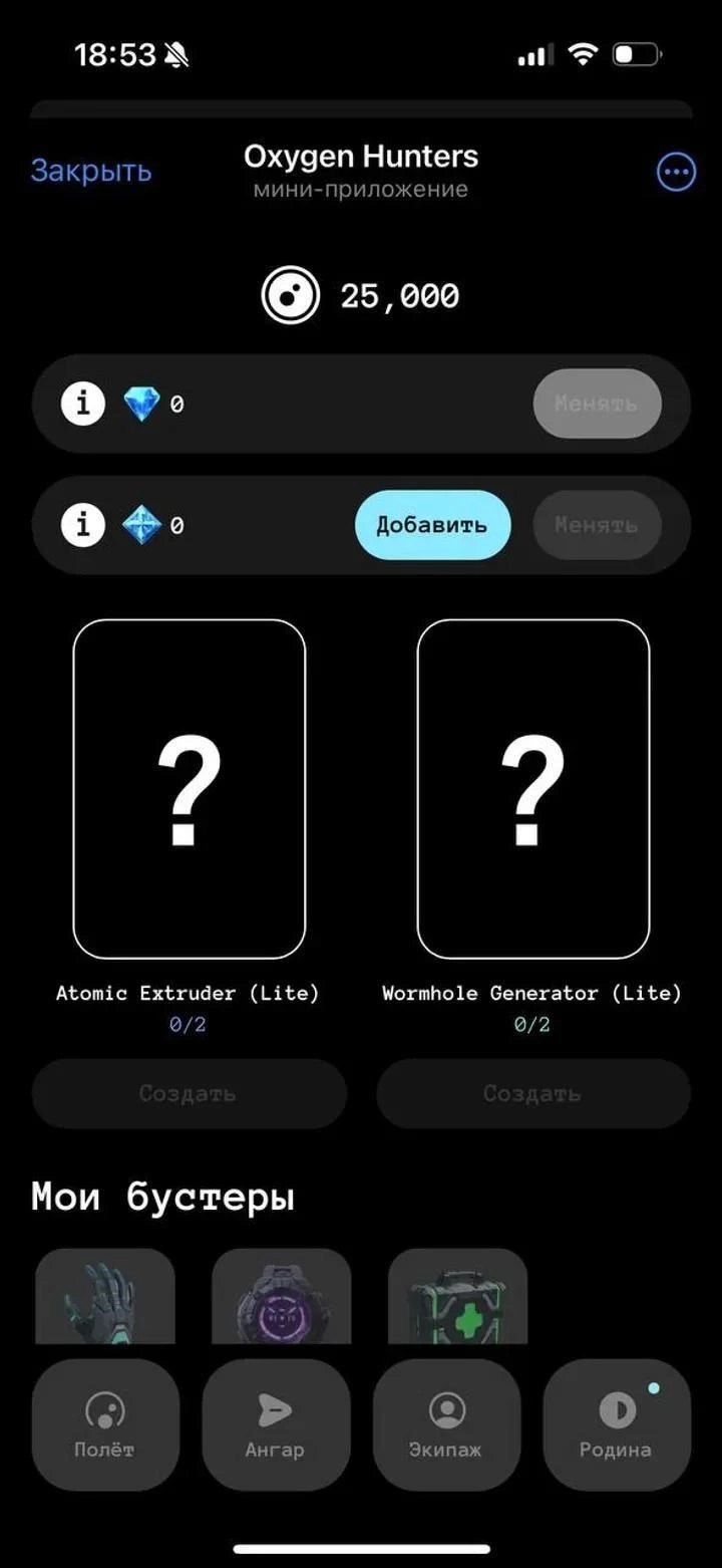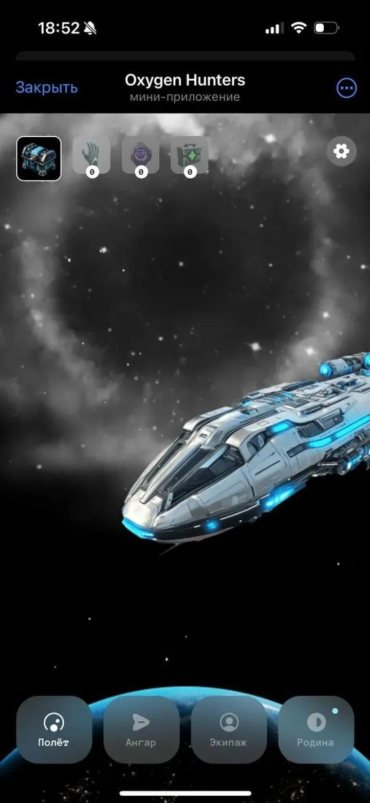 Oxygen Hunters - игровое мини-приложение с элементами Play-to-Earn, где пользователь проходит космические миссии, собирает ресурсы и обменивает прогресс на внутриигровые награды. Проект сочетает простую механику кликов/миссий с постепенным развитием корабля и экипажа.