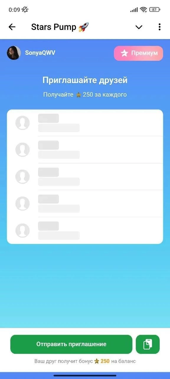 - Рефералы: скопировать личную ссылку и делиться ею - приглашённые юзеры приносят дополнительные Stars.