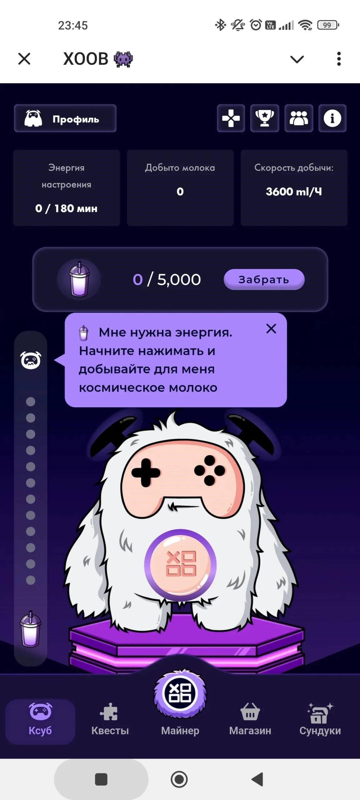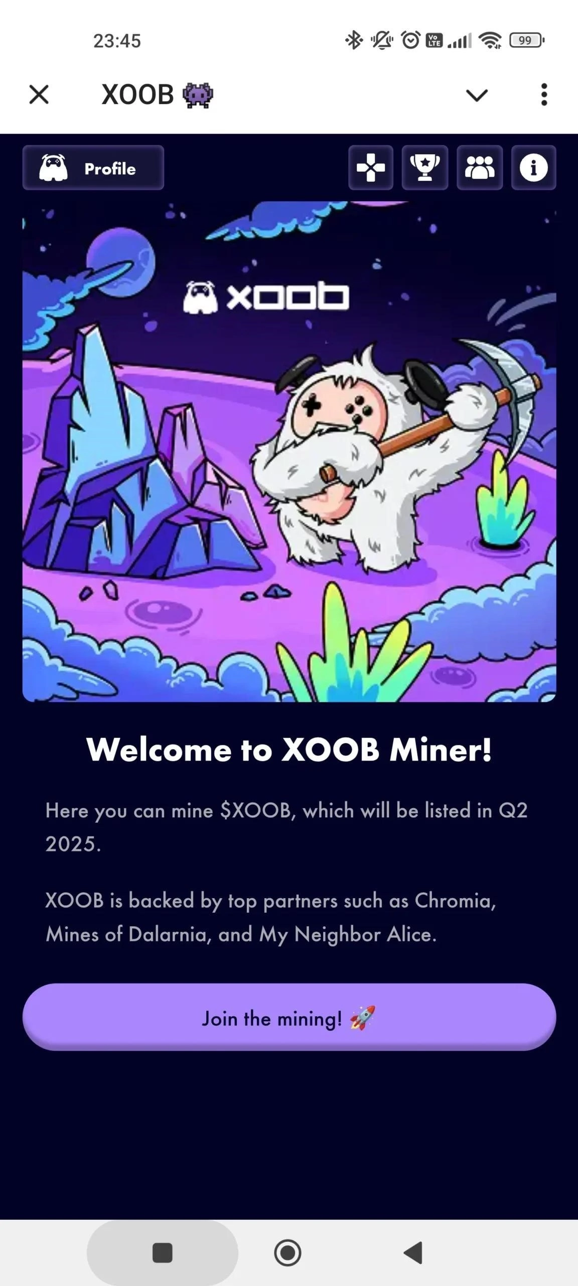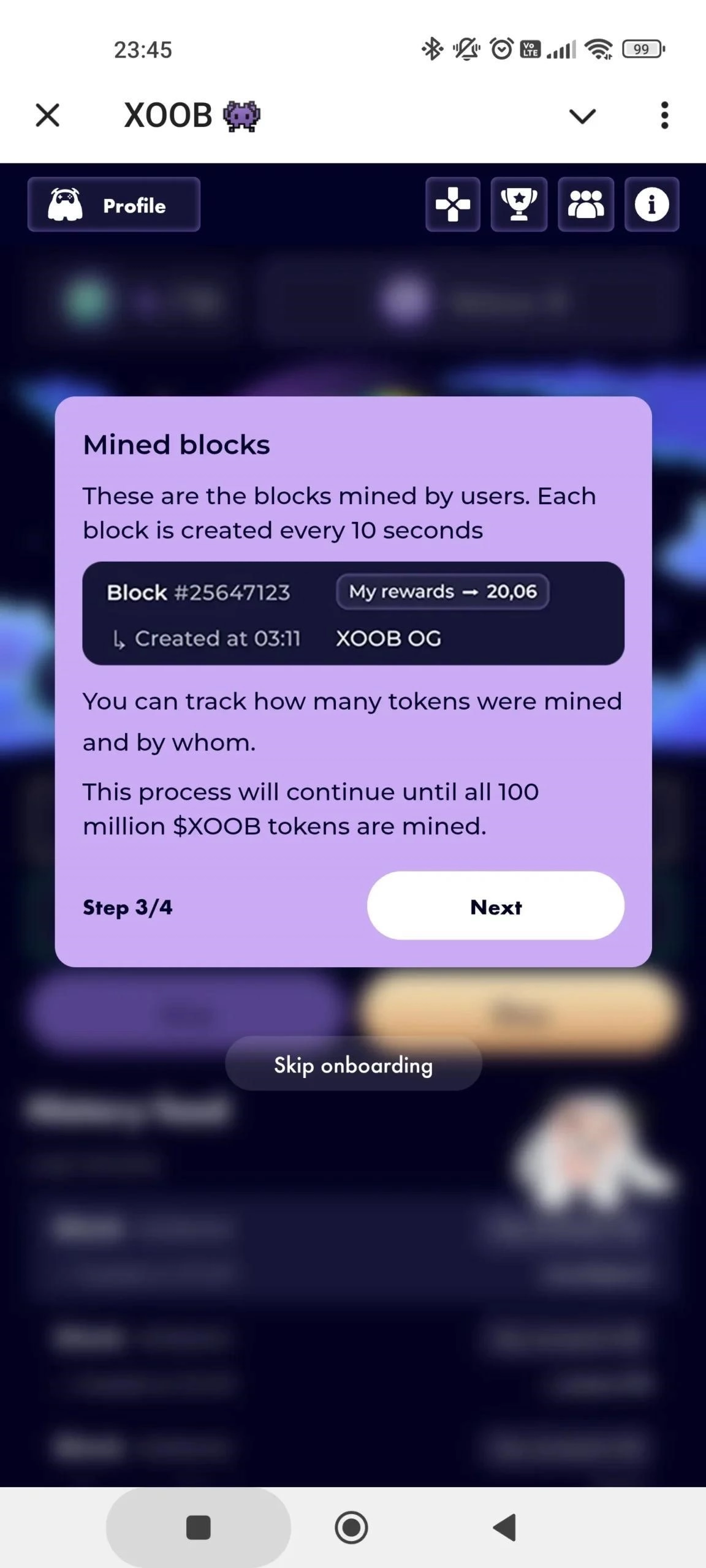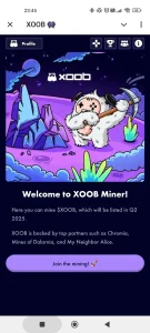 XOOB - игровое мини-приложение с элементами майнинга, в котором юзеры за активность и выполнение задач получают внутриигровую валюту $XOOB. Проект сочетает простую механику кликов, ежедневные квесты и систему кодов, стимулирующую регулярные заходы.