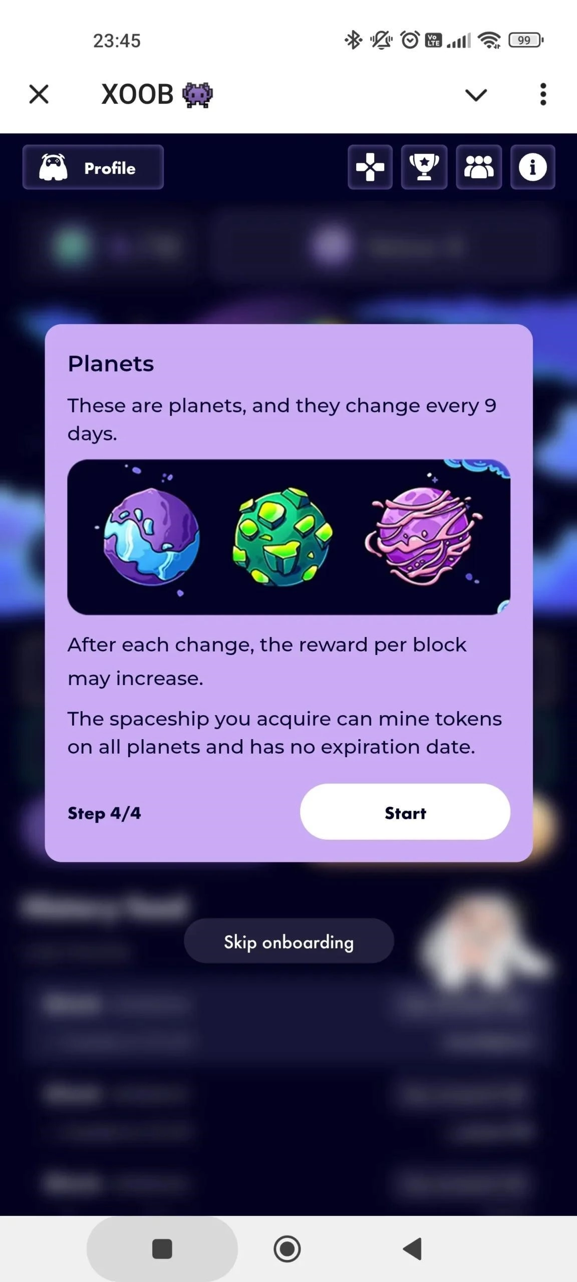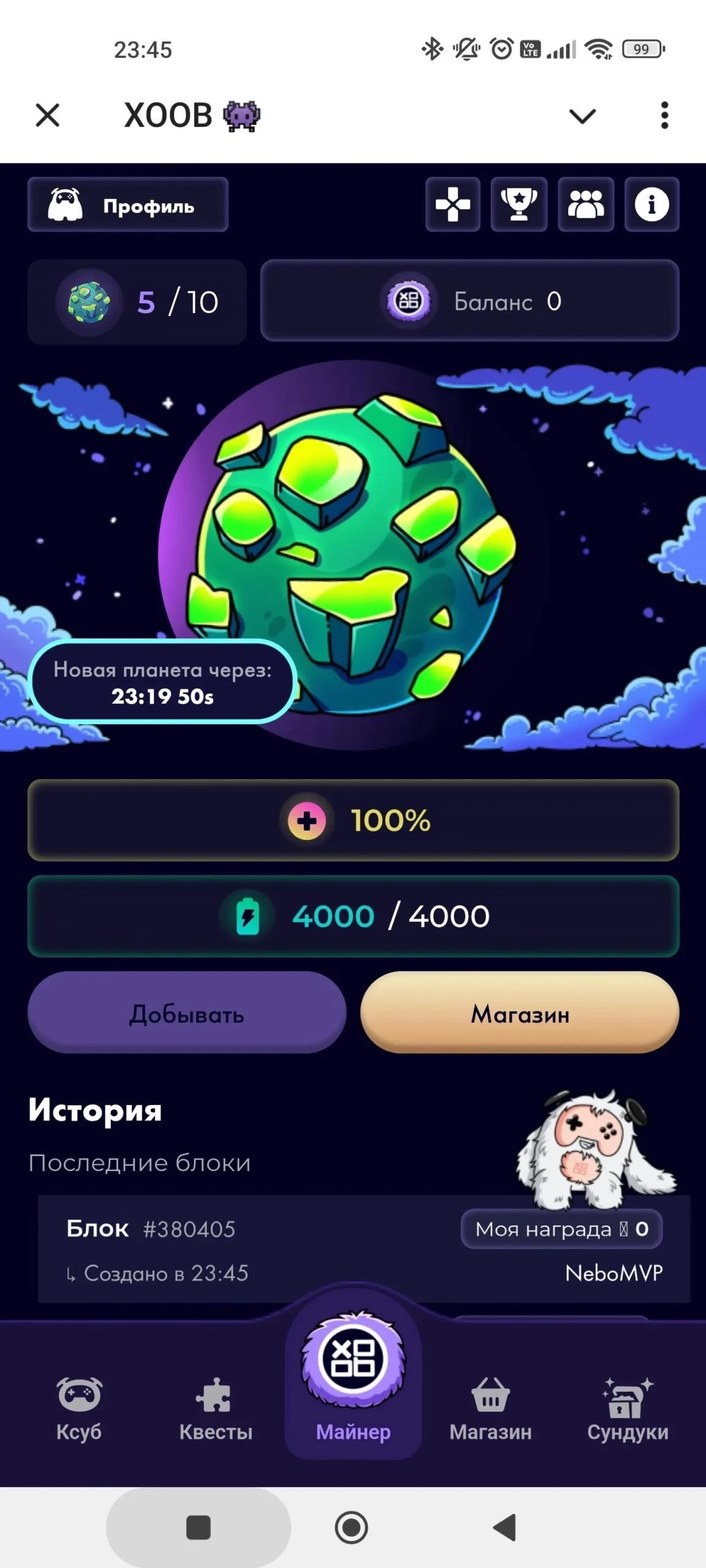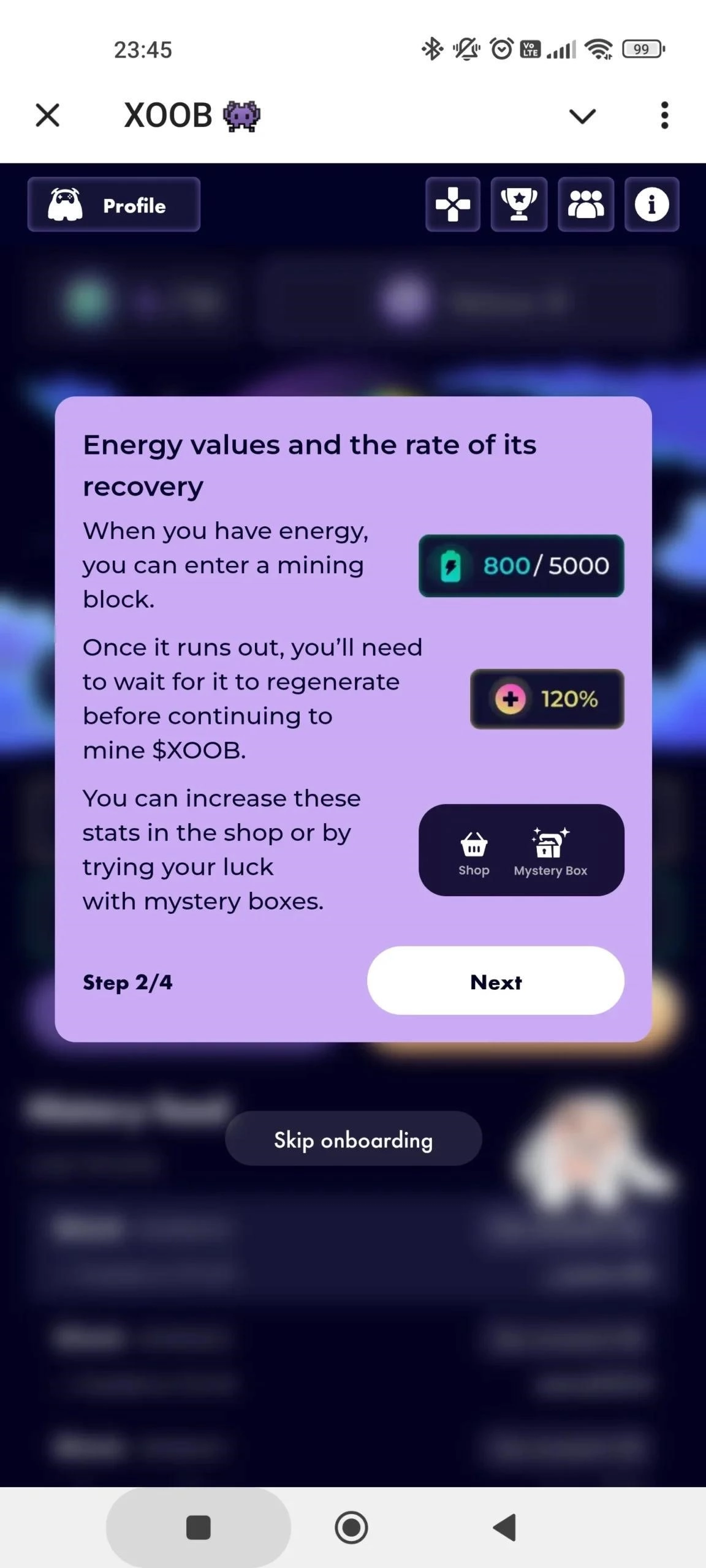 XOOB - игровое мини-приложение с элементами майнинга, в котором юзеры за активность и выполнение задач получают внутриигровую валюту $XOOB. Проект сочетает простую механику кликов, ежедневные квесты и систему кодов, стимулирующую регулярные заходы.