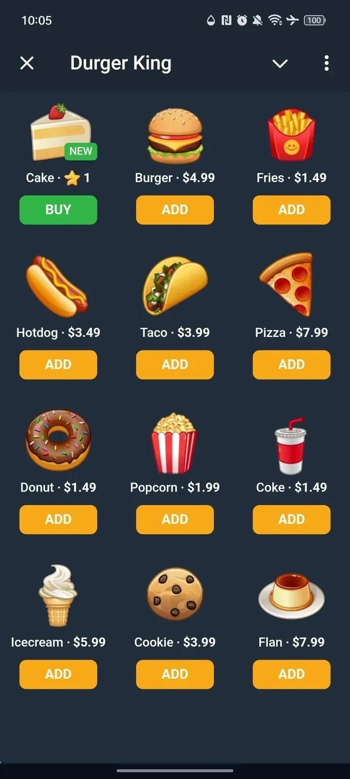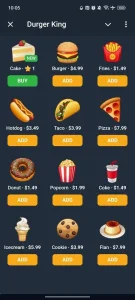 - Оформлять виртуальные заказы с выбором еды и напитков.