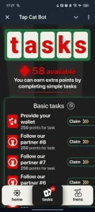 Tap Cat Bot - игровое мини-приложение, построенное вокруг простых механик клика и сбора очков. Юзеры взаимодействуют с забавным персонажем-котом, чтобы зарабатывать баллы, участвовать в заданиях и открывать дополнительные возможности. Игра сочетает в себе элементы развлечения и геймификации.