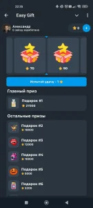 Easy Gift - игровой бот с кейсами и заданиями, где юзеры открывают коробки с призами, копят внутриигровые ресурсы и участвуют в розыгрышах. Механики построены на простых действиях: ежедневно заходить, выполнять квесты, приглашать друзей и забирать бонусы.