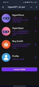 HyperGPT_AI_bot - мини-приложение с инструментами ИИ, которое отвечает на вопросы и генерирует тексты прямо в чате, а также подключает к экосистеме HyperGPT и магазину AI-приложений HyperStore.
