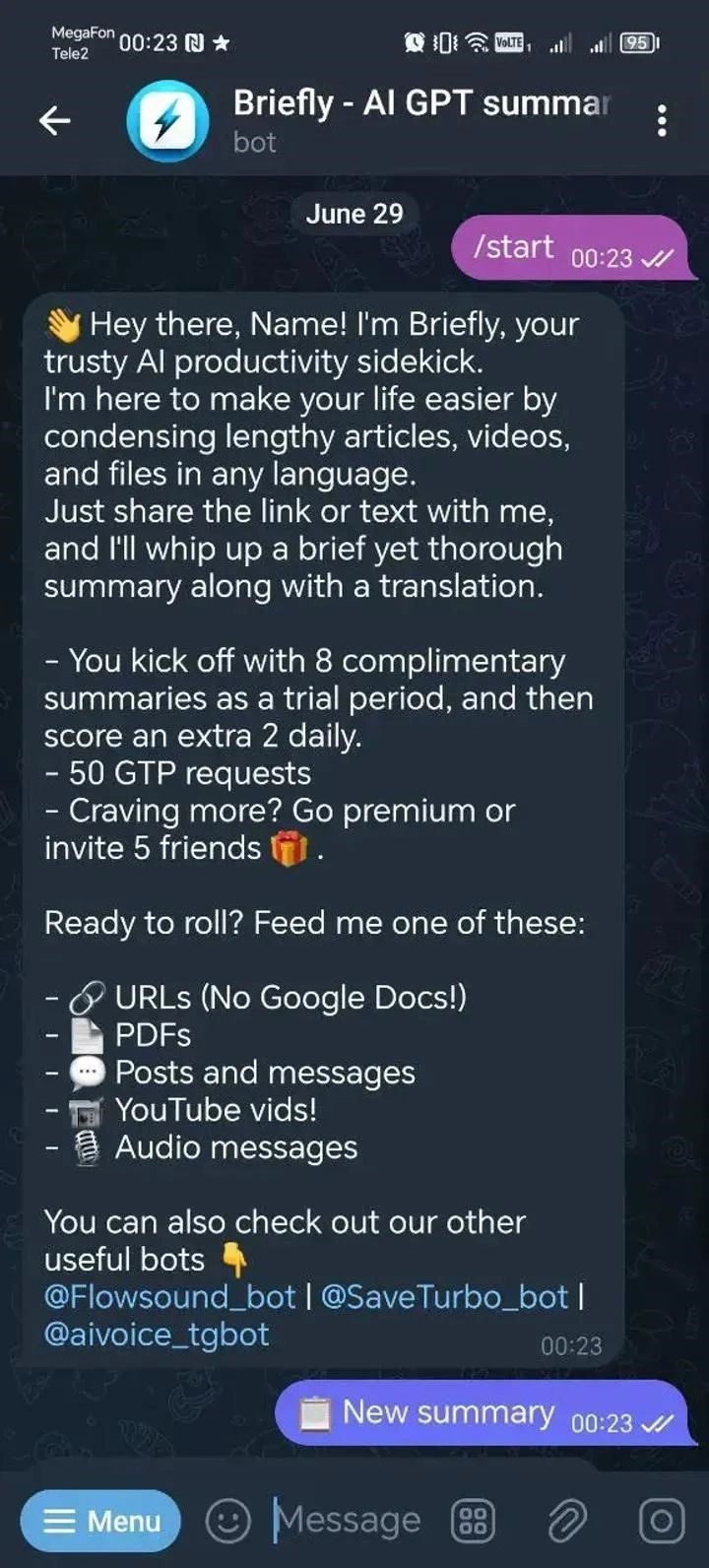 ΠΠΎΠ»ΡΠ·ΠΎΠ²Π°ΡΠ΅Π»Ρ ΠΎΡΠΏΡΠ°Π²Π»ΡΠ΅Ρ ΡΡΡΠ»ΠΊΡ ΠΈΠ»ΠΈ ΡΠ°ΠΉΠ», ΠΏΠΎΡΠ»Π΅ ΡΠ΅Π³ΠΎ ΠΠ Π°Π½Π°Π»ΠΈΠ·ΠΈΡΡΠ΅Ρ ΠΌΠ°ΡΠ΅ΡΠΈΠ°Π» ΠΈ Π²ΠΎΠ·Π²ΡΠ°ΡΠ°Π΅Ρ ΠΊΠΎΡΠΎΡΠΊΠΎΠ΅ ΡΠ΅Π·ΡΠΌΠ΅ Ρ ΠΊΠ»ΡΡΠ΅Π²ΡΠΌΠΈ ΡΠ΅Π·ΠΈΡΠ°ΠΌΠΈ. ΠΠΎΠ΄Π΄Π΅ΡΠΆΠΈΠ²Π°ΡΡΡΡ ΠΏΠΎΠΏΡΠ»ΡΡΠ½ΡΠ΅ ΡΠΎΡΠΌΠ°ΡΡ (Π²ΠΈΠ΄Π΅ΠΎ, PDF, Π²Π΅Π±-ΡΡΡΠ°Π½ΠΈΡΡ, ΡΠ΅ΠΊΡΡΡ ΠΈ voice-ΡΠΎΠΎΠ±ΡΠ΅Π½ΠΈΡ), ΠΏΠΎΡΡΠΎΠΌΡ Π½Π΅ Π½ΡΠΆΠ½ΠΎ Π²ΡΡΡΠ½ΡΡ ΠΏΡΠΎΡΠΌΠ°ΡΡΠΈΠ²Π°ΡΡ ΠΈΠ»ΠΈ ΠΏΠ΅ΡΠ΅Π»ΠΈΡΡΡΠ²Π°ΡΡ Π΄ΠΎΠΊΡΠΌΠ΅Π½Ρ - Π΄ΠΎΡΡΠ°ΡΠΎΡΠ½ΠΎ ΠΎΠ΄Π½ΠΎΠ³ΠΎ Π·Π°ΠΏΡΠΎΡΠ°.