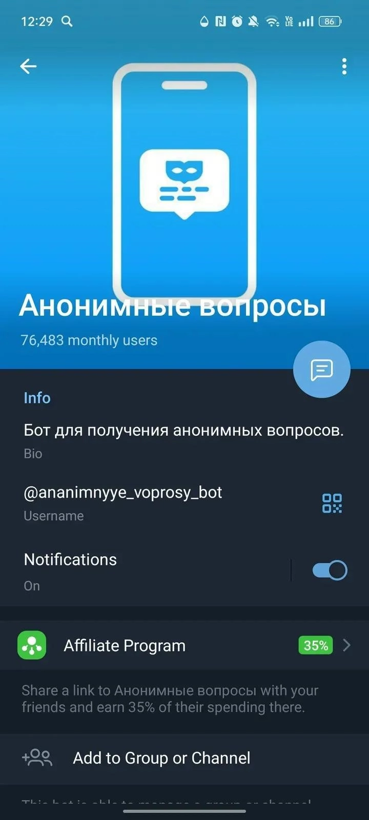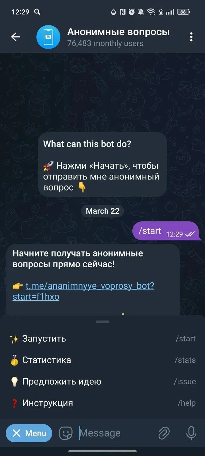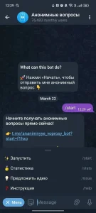 @ananimnyye_voprosy_bot создан для того, чтобы пользователи могли анонимно задавать вопросы друг другу, получать честные ответы и использовать его как инструмент обратной связи. Такой подход помогает наладить коммуникацию в команде, сообществе или просто среди друзей, не раскрывая личность автора вопроса.