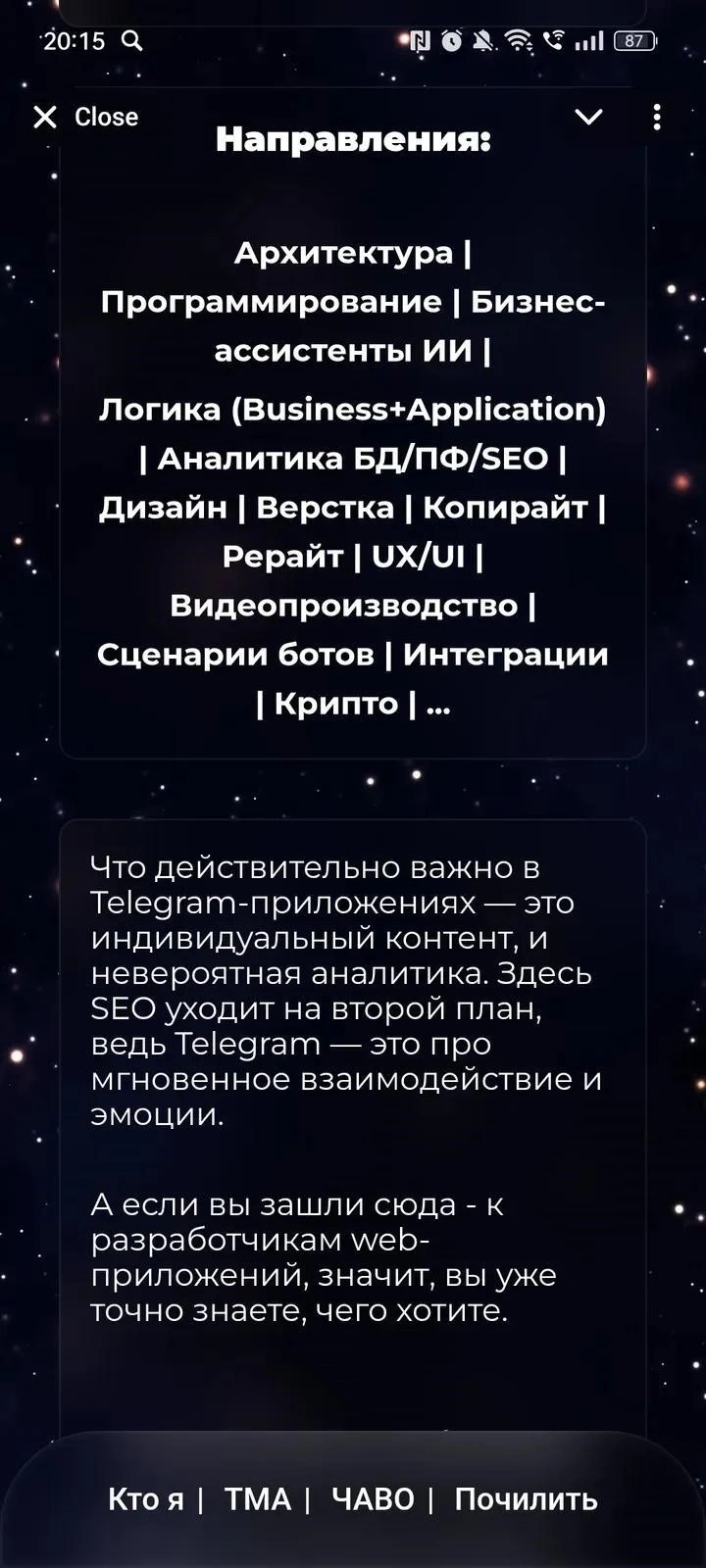 Основная идея - собрать в одном месте полезные веб-приложения и дать возможность запускать их в один тап. Интерфейсы адаптированы под мобильные экраны, а запуск происходит без переключения между сервисами.