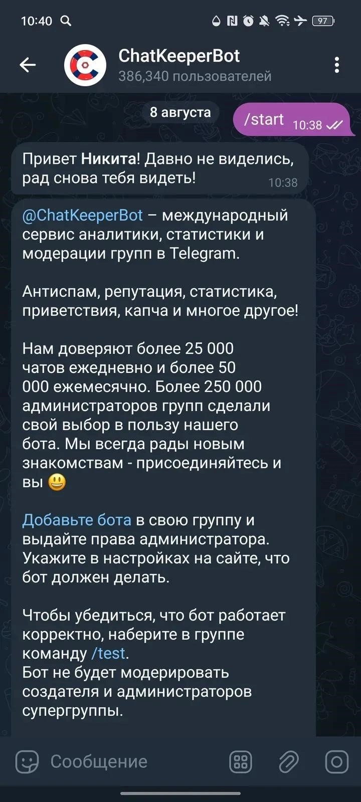 Рабочая ссылка на ChatKeeperBot в Телеграм доступна ниже. Если она не открывается, сообщите нам - мы всё исправим.