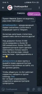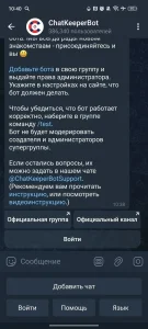 ChatKeeperBot - сервис для управления группами: автоматическая модерация, антиспам, капча для новичков, приветствия, предупреждения и статистика активности. Он упрощает поддержание порядка в больших сообществах и дает организаторам наглядную аналитику по событиям в чате.